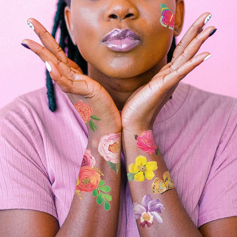 Add a touch of boho beauty to everyday looks by layering these with your fave jewels, pair with your fave swimsuit, or add a feminine statement to cocktail dresses at weddings by wearing a bouquet of flower tats in lieu of traditional accessories. Shine like a true flower child in Emma!