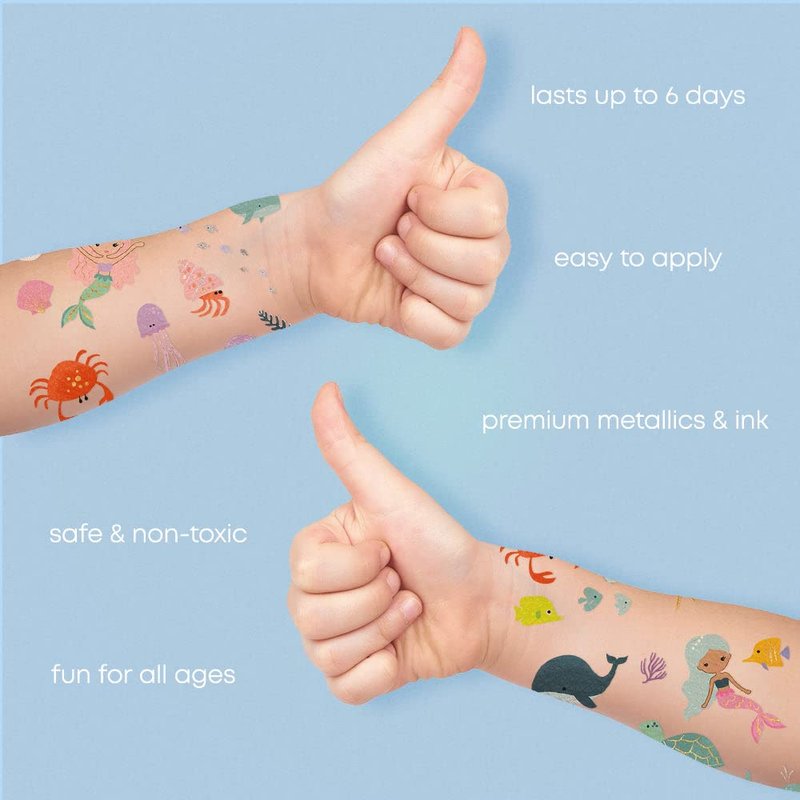 WHAT’S INSIDE: Two 4” X 6” sheets of premium temporary tattoos featuring 42 colorful and metallic foil tattoos in assorted designs that include: mermaids, whales, fish, octopus, jellyfish, crabs, sea shell, turtle and starfish.