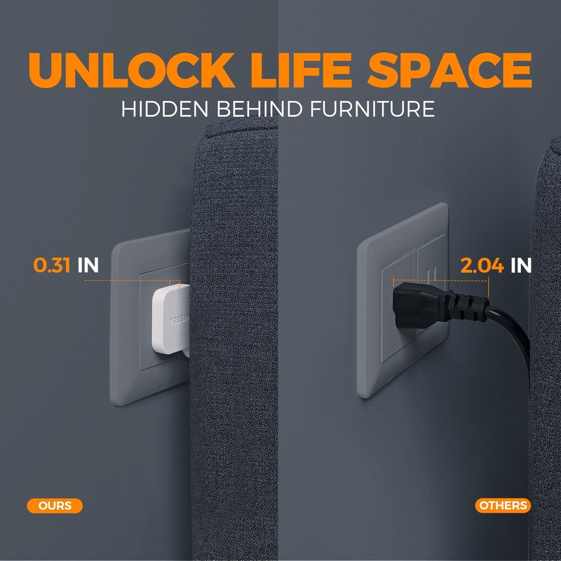 - Flat Plug Power Strip: With only 0.31 in ultra thin flat head design, flat wall plug can easily fit in tight spots and hide behind sofa, bed, nightstand or other furniture, sitting flush against the wall; 45° right angle design create an extra space for other plug below without blocking