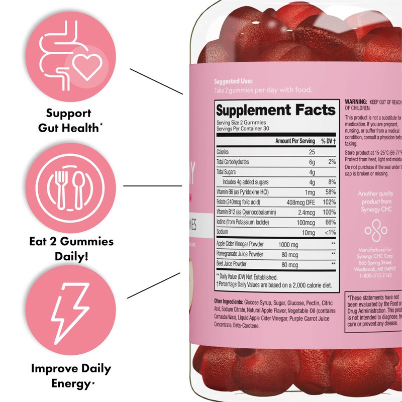 - VEGAN, NON-GMO, GLUTEN & GELATIN-FREE: Each bottle of Flat Tummy Apple Cider Vinegar Gummies is packed with Vitamin B9, B12 and are made with apples, Beetroot, and Pomegranate to help improve energy, support complexion and so much more.