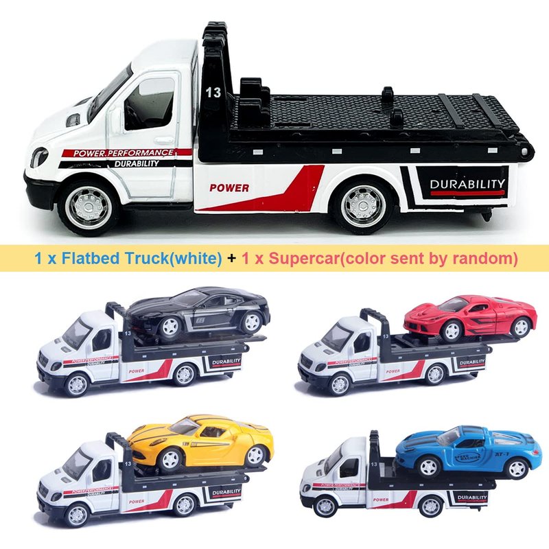 - [Flat Bed Truck] This truck toy is a miniature of supercar transport truck, the size is small and it is a good addition to your kids’ truck toy collection.