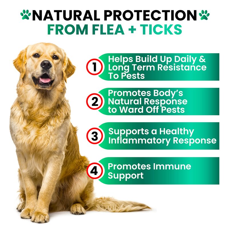 - Natural Flea & Tick Prevention - Our supplement is made with natural ingredients that helps to prevent fleas and ticks from biting your dog. It's an easy way to keep your pet free from pests