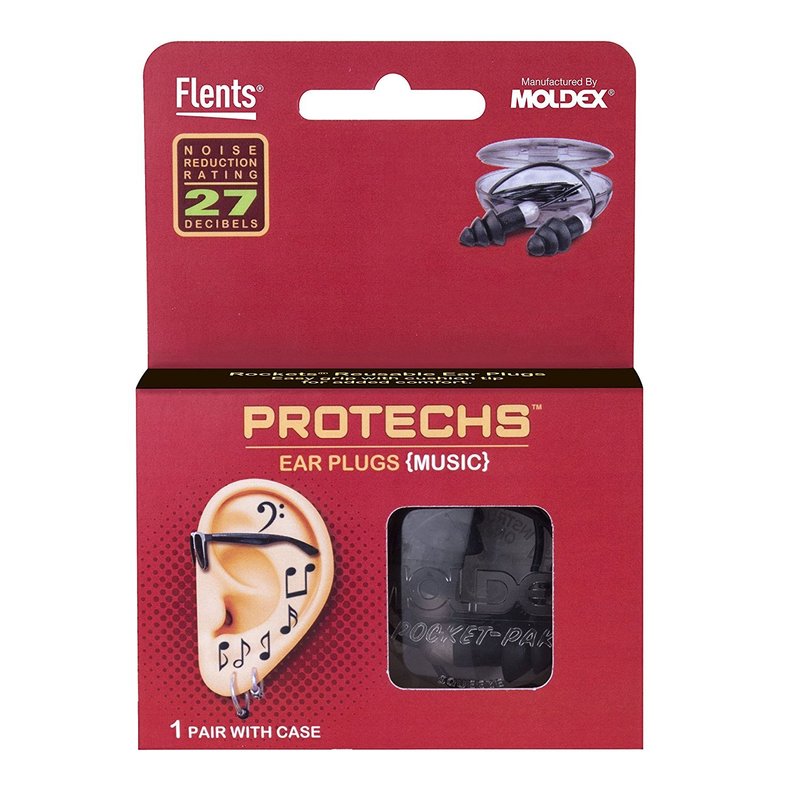 Flents Protechs Reusable Music Ear Plugs, Perfect For Concerts, Reduces Pressure And Background Noise, 1 Pair With Travel Size Case, Easy Use With Comfort Fit, NRR 27, Black, Made In The USA