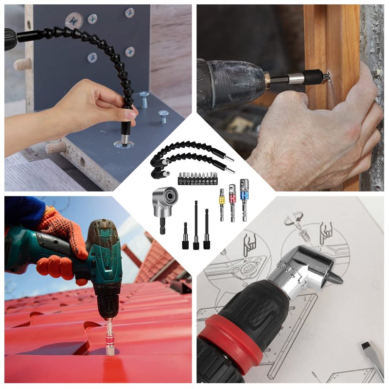 - ✑High-Quality Drill Extension Kit: The drill extension kit is made of high-quality industrial-grade heavy-duty chrome vanadium steel. Set of drill including 2 x flexible drill extension, 1 x 105° right-angle drill bit extension, 3 pieces of (1/2, 3/8,1/4) universal socket adapter kit, 3 x quick release magnetic drill extension Pieces, 10 in 1 set combination screwdriver bit set, durable, and can be used for a long time.