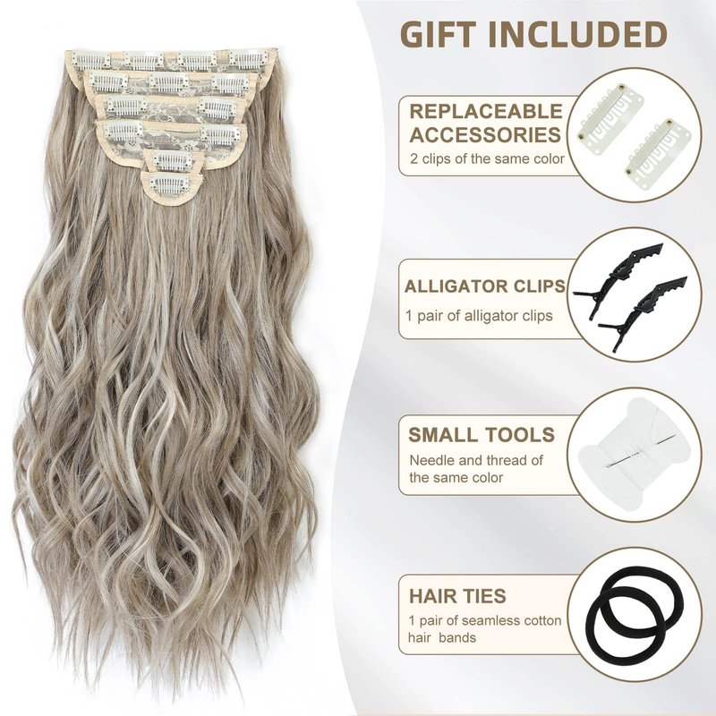 FLIACE Hair Extensions Clip ins, 6 PCS Wavy Extensions, Light Gray&Ash Blonde&Light Brown Thick Hair, Blends Well Hair Extensions (20Inch, 6PCS, Gray Brown&Ash Blonde)
