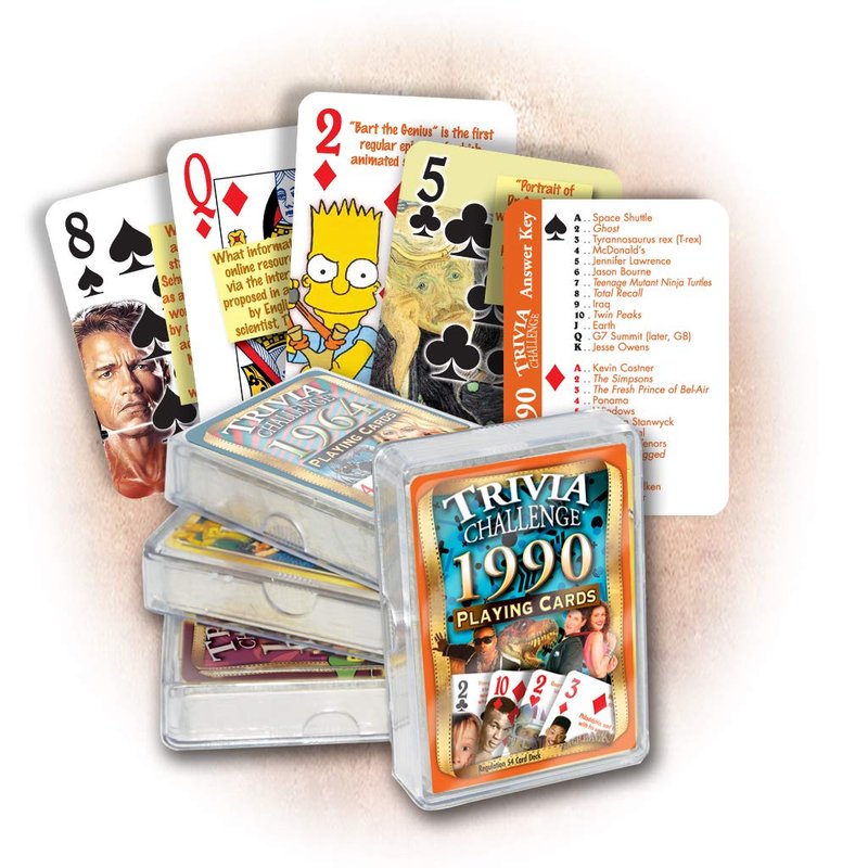 Can you name the “Emotions” singer with a five-octave range who became the first and only artist to have her first five singles reach the #1 spot? Or which Pixar release was the first full-length animated movie to utilize CGI (computer-generated imagery)? Why was baseball's 1994 World Series cancelled? And which son of a U.S. President, along with his wife and sister-in-law, were killed in a tragic 1999 private plane crash? Test your knowledge of the decade or quiz your friends. Every deck has 52 colorful illustrated questions specifically about ‘90s celebrities, sports, events, movies, music and much more. A Key Card is provided with all the answers, as well as a pair of Jokers loaded with fascinating ‘90s baseball & NFL stats. Plus, the cards double as a regulation playing card deck!