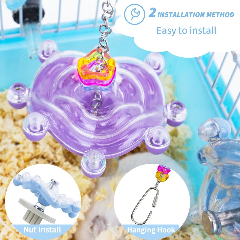 - 2PCS Hamster Enrichment Toys: Package includes 2 pcs hamster spinner toys with different installation methods. One is designed with stainless steel chains and hooks can be hung anywhere, the other is a nut that can be attached to cage