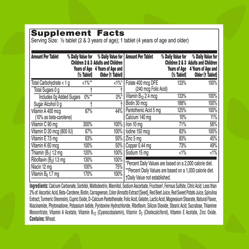 - Directions: Under adult supervision, product should be fully chewed or crushed Children 2 & 3 years of age: Fully chew one-half tablet daily, with food Adults and children 4 years of age and older: Fully chew one tablet daily, with food