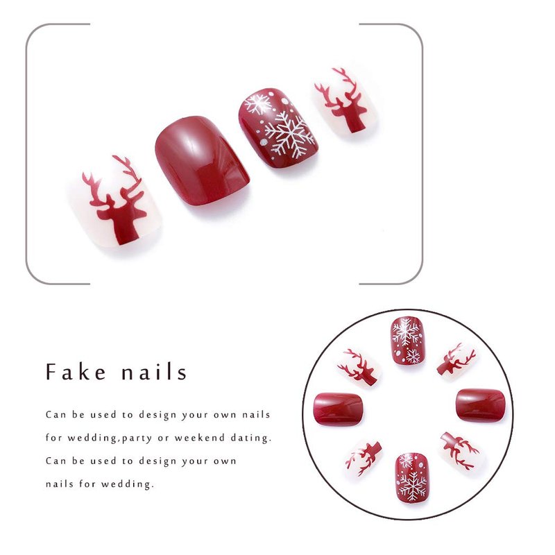 Our product of Short Press on Nails made of high quality, non-toxic, not hurting hands material, easy to wear and disassemble for women and girls .it can last about 1-2weeks How to use 1.Polishing the smooth nail surface with a nail file, which will wearing the false nails better. 2.clean and dry your nails for a better fit. 3.Select the appropriate double-sided tape, cut off the inappropriate parts with scissors, and press 1 double-sided nail sticker on the back of the false nail (or use your own nail glue) 4.File new nails as your need. How to remove 1.Put your nails in warm water for 2 minutes which will remove nail sticker easier. 2.Do not remove it suddenly, it may leave some marks on the nail surface. In this case, you can also wash the remaining nails with water. Warm tips Actual colors may vary.This is due to fact that every computer monitor or smart phone has a different capability to display colors. Product content:We will send you a manicure stick,double-sided tape(glue is not provided due to health and safety reasons ),24 PCS set has 12 different sizes Christmas Fake Nails