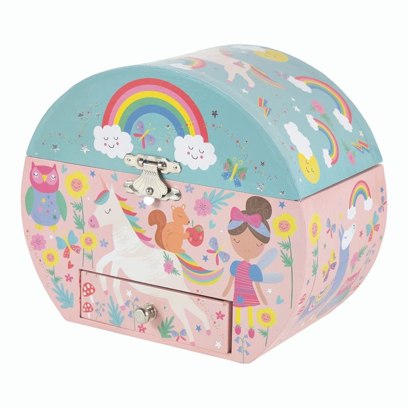 Our musical jewellery boxes are so sweet and are one of our best-selling products! The Rainbow Fairy Circular Jewellery Box is covered with gorgeous illustrations of fairies, unicorns, rainbows and more. The handy drawer is perfect for storing treasured trinkets. Wind the key up at the back, then lift the lid to see a magical unicorn twirl around to the tune of ‘you are my sunshine’ Floss & Rock is a British business based in the very traditional seaside town of Blackpool, famous for its candy floss (cotton candy) and sticks of rock (candy). Owned and managed by husband and wife team (Tim and Gill) we are passionate about designing gifts and toys for girls and boys aged 3 to 10. Twice yearly we launch up to 100 exclusively designed new products and exhibit them at trade shows right across the globe. We believe in setting the highest possible product safety and performance standards to ensure that we meet the requirements of individual markets worldwide.