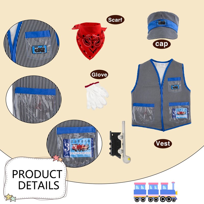 - 【Quality Material】: Kids train engineer vest is made of nylon fabric, which is wear-resistant and durable, not easy to break, and fully unleashes children's playful nature. The red scarf is brightly colored and beautifully printed. It is not easy to fade or deform and can be used for a long time.The gloves are made of cotton yarn, soft and breathable to protect children's hands from injury