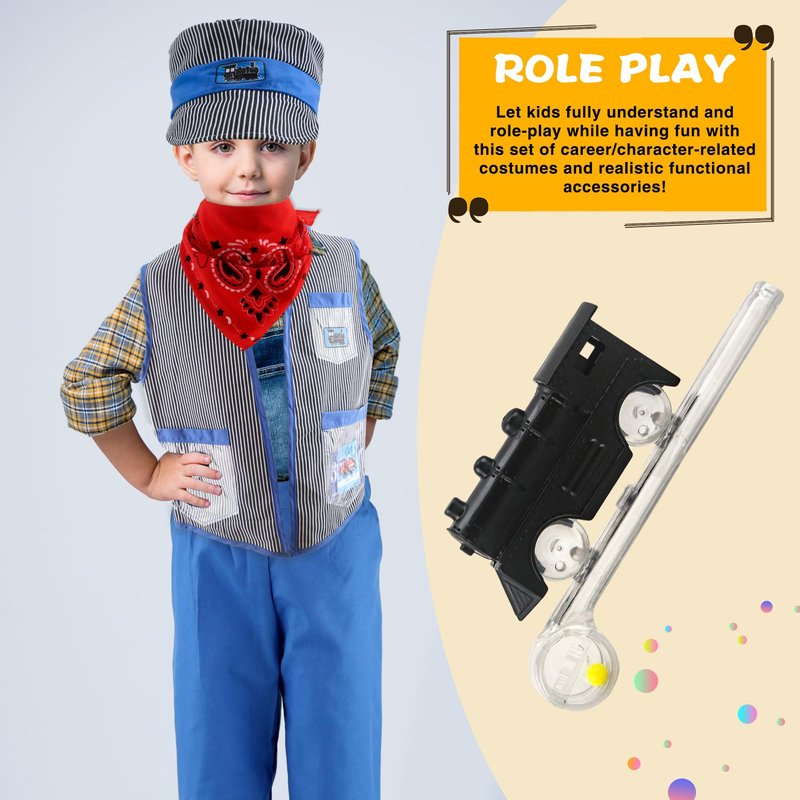 Children's train engineer vest set will help your children learn about the profession of train engineer and use their imagination to dress up. Set contains a variety of train party supplies for kids train engineer role play and parties, Halloween costumes, train engineer themed parties, train conductor costumes, Christmas, birthday and more gifts