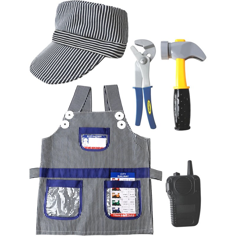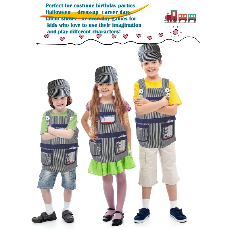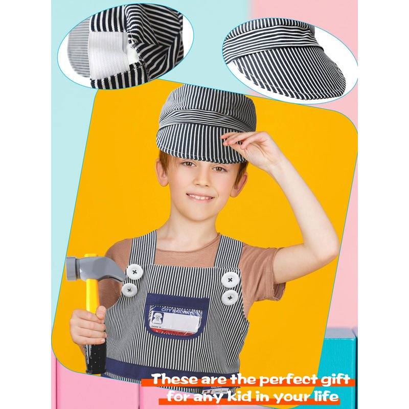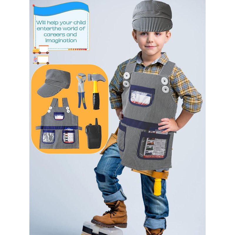 - 【Size Detail】: Kids train engineer hat and top are the perfect size for children aged 3 to 12 years old. The top is about 19.7 inches/ 50 cm long and has Velcro on the side to adjust the waist as needed. It is simple and comfortable and will not affect children's daily activities. There are also small toy tools that fit children's little hands, making it easy to show the image of a train engineer