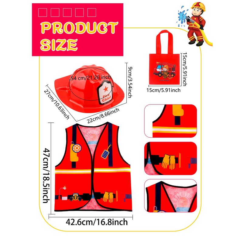 - 【Wide Application】: Kids firefighter set is a surprise gift for children. It not only satisfies children's desire for firefighters, but also cultivates children's hands-on ability, making them more aware of the responsibilities and hard work of firefighters. Whether it is a birthday, Halloween party, Christmas party, school role-playing activities, dress-up career day, stage performance, it can be used
