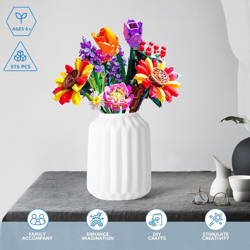 - 8 TYPES OF 17 FLOWER BOUQUETS: Flower bouquet is composed of 976 blocks, 8 types of 17 flowers building, inspired by real flowers such as sunflowers * 2, chamomile * 3, babysbreath * 2, lavender * 2, tulips * 2, ammonite (fern) * 2, lisianthus * 2 and hypericum * 2. You can freely DIY the flower shape and height, adding more modern design for your home decoration