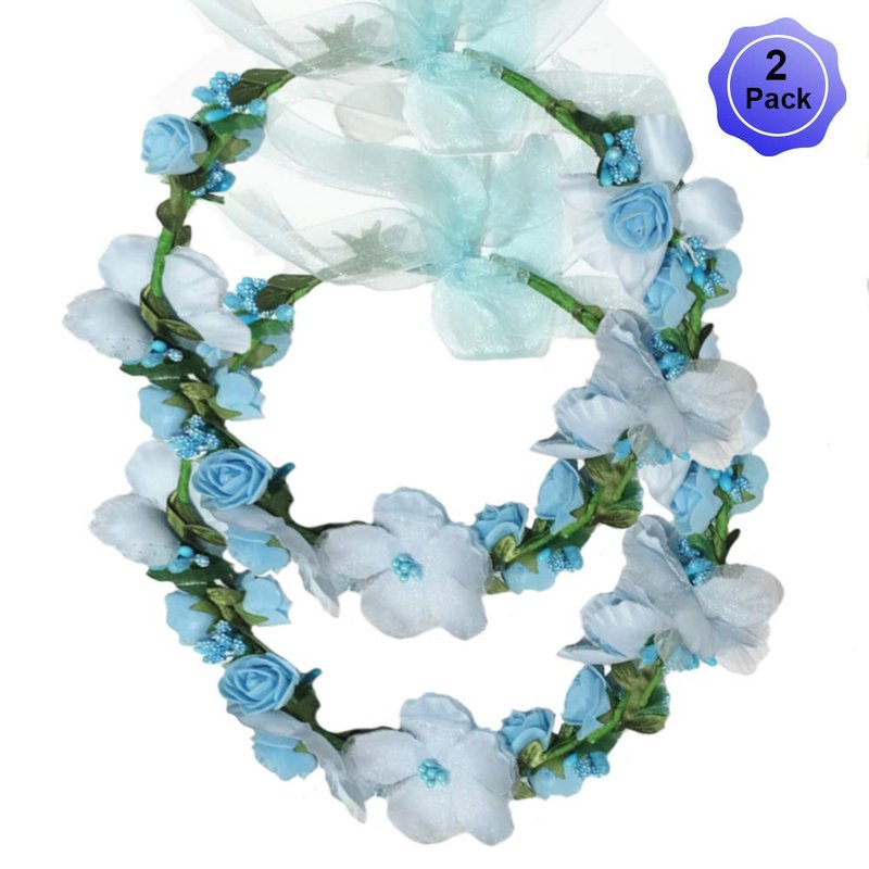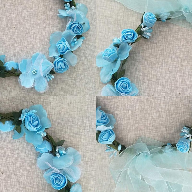 Flower Crown Headband Wreath Garland Hair Bands Floral Wedding Bridal Hair Hoop Women Leaf Ribbon Party Decoration Headdress Headwear Christmas Handmade Headpiece Hair Accessories 2 Pack Blue