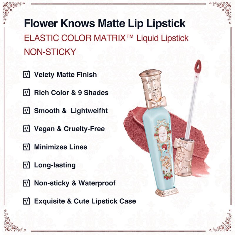 - 💄【Premium Matte Lip Cream】Discover the new Flower Knows Rococo Cloud Matte Liquid Lipstick,featuring a silky texture that glides on smoothly without stickiness.Formulated with non-alcoholic,non-volatile oils,it hydrates without clumping or flaking.