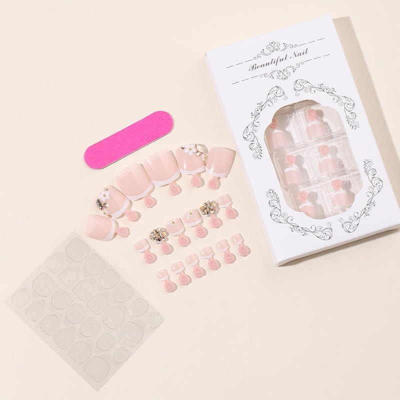 - Press on Toenails : 24 PCS Toe Press on Nails & A Nail File & Jelly Glue Stickers.(Durability of jelly glue is NOT as good as liquid glue, but it makes fake nails REUSABLE. Please use suitable glue according to different scenes)