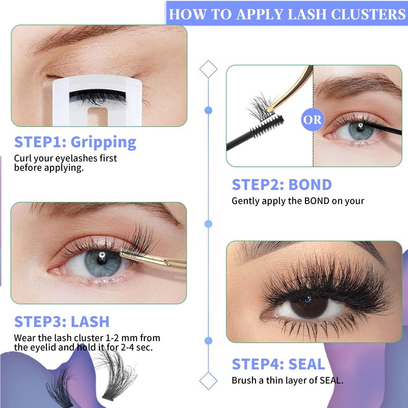 - 【Application Tips】1.Apply lash BOND on your natural eyelashes;2.place the lash clusters underneath your lashes;3.use lash SEAL brush to Lock. Beautiful makeup is complete!