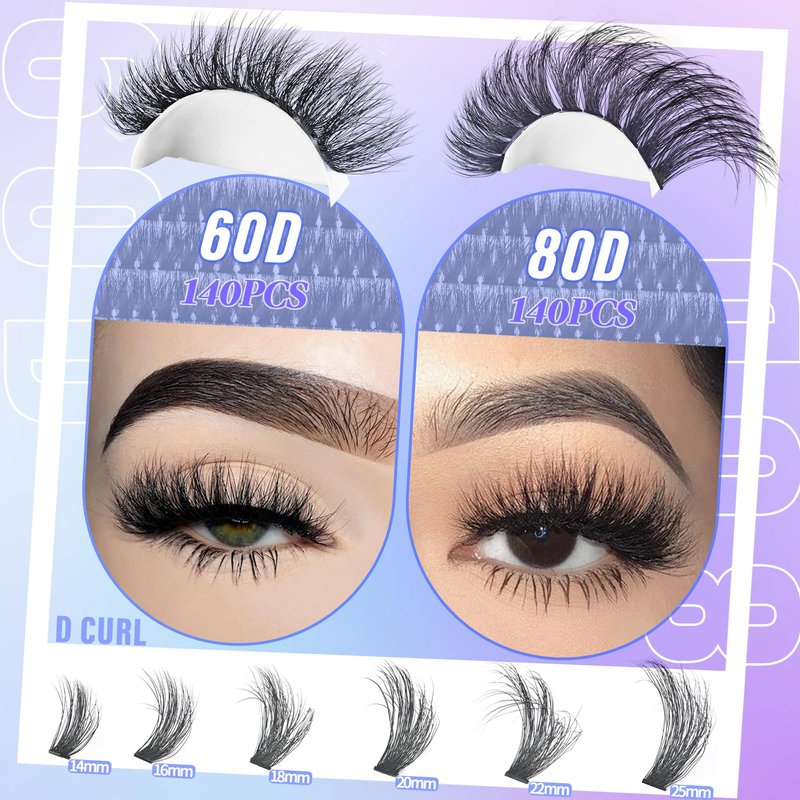 - 【60+80D Lashes Clusters Fluffy Thick 】280pcs Volume cluster eyelashes pack with 6 length ( 14/16/18/20/22/25mm) clusters lashes,140pcs 60D lash clusters and 140 pcs 80D lash cluster fluffy and volume cluster lashes extension is suitable for girls with various eye types.You can match different lengths to get fluffy and lovely clusters eyelash. Both dramatic and natural styles can be satisfied