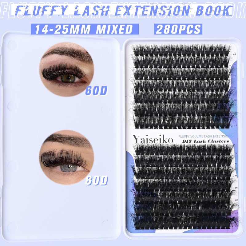 Fluffy Lash Cluster Eyelash Extensions 14-25mm Thick Lash Clusters 60D+80D D Curl Wispy Individual Lashes 280pcs False Eyelashes DIY Plant Fibers Lash Extension, by Yaiseiko
