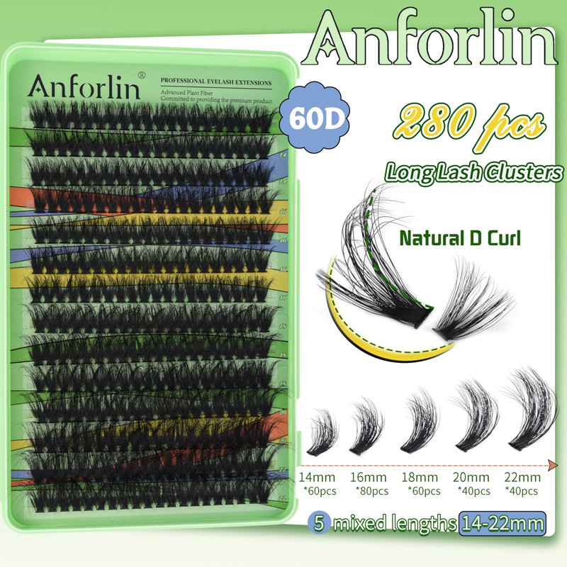 - 【GET MORE LASH CLUSTERS FOR LESS MONEY】 Anforlin offers 280pcs 60D fluffy individual lashes that are more cost-effective, affordable. Providing different lengths, from 14-22mm, with stable D curl, to create more styles as you like.