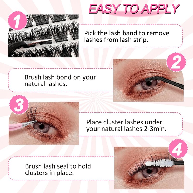 - Easy To Use and Perfect Long Lasting: The eyelash adhesive in the kit is designed as a 2 in 1 eyelash adhesive and eyelash sealant.One side is an eyelash adhesive and the other side is an eyelash sealer. Making these clusters lashes easier to use and providing a longer-lasting hold.