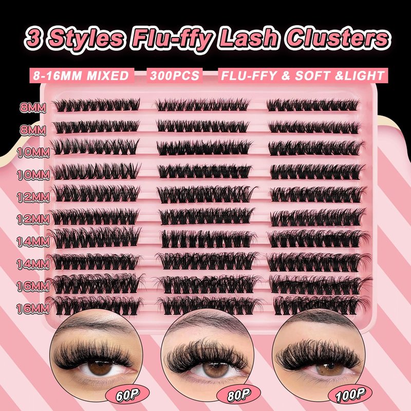 Fluffy Lash Clusters Kit 300pcs DIY Lash Extension Kit, 8-16mm Wispy Lash Clusters Kit Natural 60+80+100D Mixed Eyelashes Kit C Curl with Lash Bond and Seal and Lash Applicator Tool.(60-80-100p-FPB)