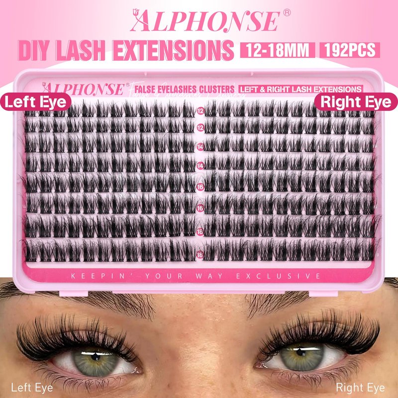 ALPHONSE Left & Right Cat Eye Lashes Clusters, offering a mix of 12-18mm fluffy lash cluster to create the perfect daily look that suit you.< br>< br>Specifications:< br>Color: black< br>Style: left&right (fluffy)< br>Capacity: 192pcs< br>Length: 12-14-16-18mm< br>Features: reusable/cruelty-free/lightweight< br>< br>Tips on how to apply cluster lashes:< br>Step 1: Brush your natural lashes with lash bond.< br>Or: Dip lash band into a small amount of glue.< br>Step 2: Apply eyelash cluster under your natural lashes.< br>Step 3: You can choose whether to brush a thin layer of seal.< br>Step 4: Squeeze the clusters together with your natural lashes.< br>< br>Tips on how to remove lash clusters:< br>Step 1: Apply lash remover to the lashes from the bottom-up.< br>Step 2: Brush several times and gently take off lash clusters.< br>Step 3: Wipe off glue or makeup residue by wet cotton pads.