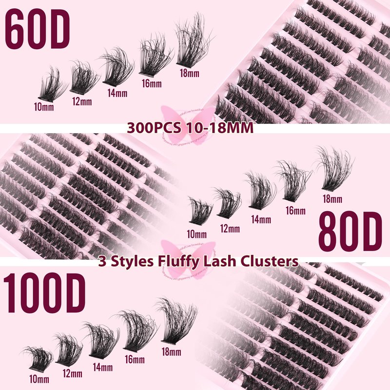 - 3 Styles Fluffy Lash Clusters: Brand New 300PCS 60D+80D+100D Fluffy Lash Clusters Kit; 3 Styles different thick eyelash clusters will meet your different makeup need; Wispy and fluffy cluster lashes fit perfectly to your eyes, giving you a gorgeous look while making your eyes sparkle