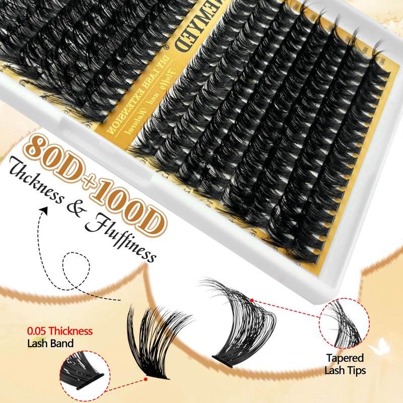 - 【Fuller, fluffy lashes await!】: Thicker, fuller, fabulous lashes await! 80D and 100D thick eyelash clusters created a volume effect. The perfect blend of curvature and thickness achieves a charming look that feels neither too heavy nor overwhelming. Ideal for any occasion, whether it's a day at work, a romantic date, or a special event.