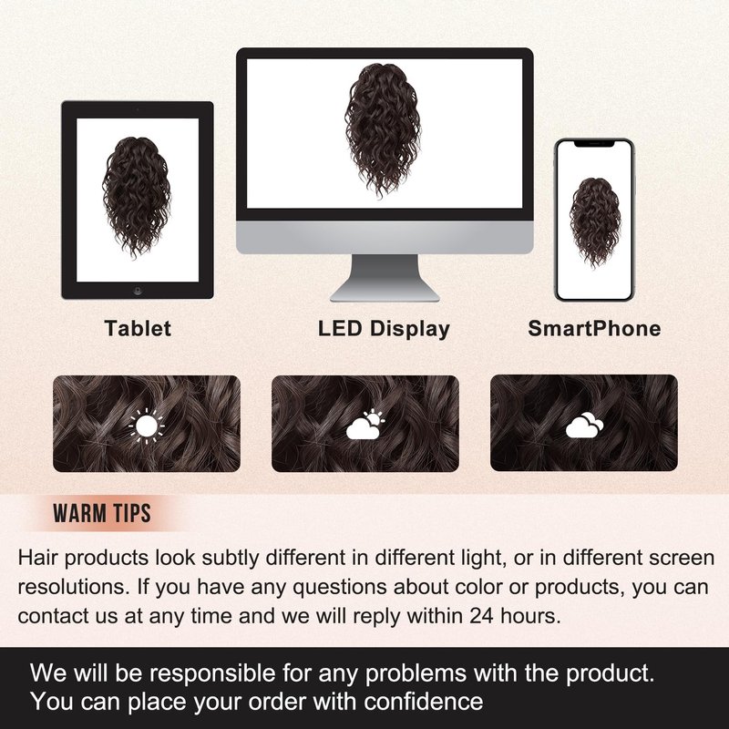 Due to the screen resolution settings, you may see some slight differences between the color tone of the ponytail extension in the photos and the claw clip ponytail extension, and Hair color can also vary slightly, this is a normal phenomenon.