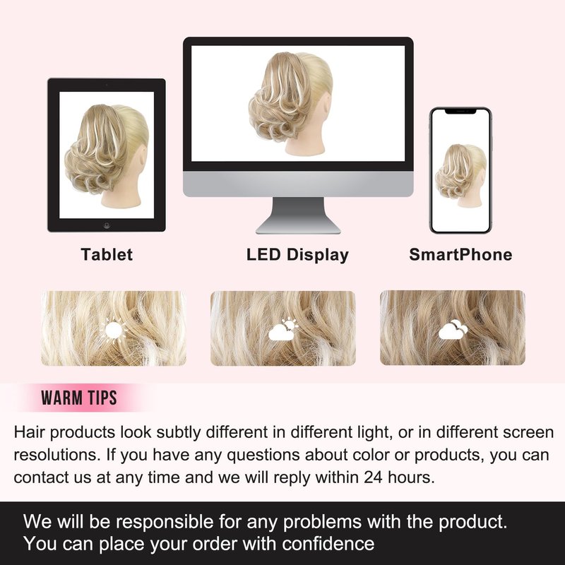 Due to the screen resolution settings, you may see some slight differences between the color tone of the ponytail extension in the photos and the claw clip ponytail extension, and Hair color can also vary slightly, this is a normal phenomenon.