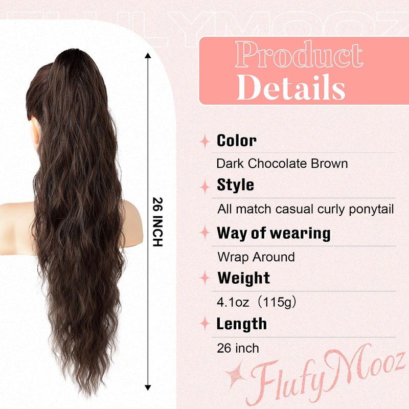 Flufymooz Ponytail Extension, Flexible Wrap Around Ponytail Extension Long Wavy Curly Ponytail Hair Extensions Natural pony tail Synthetic Hairpiece for Women 26 Inch (Dark Chocolate Brown)