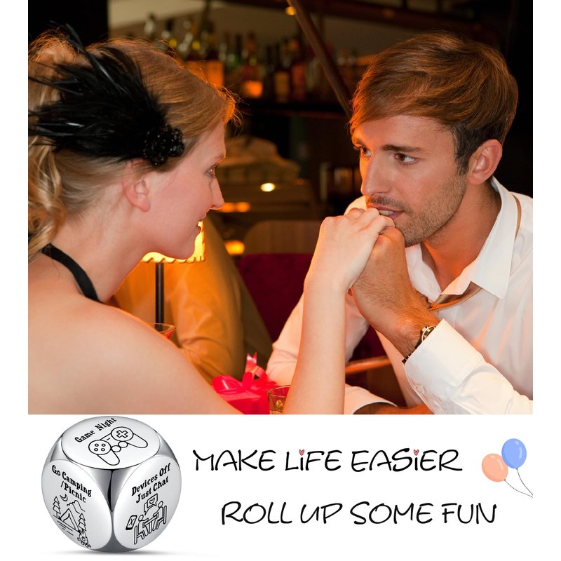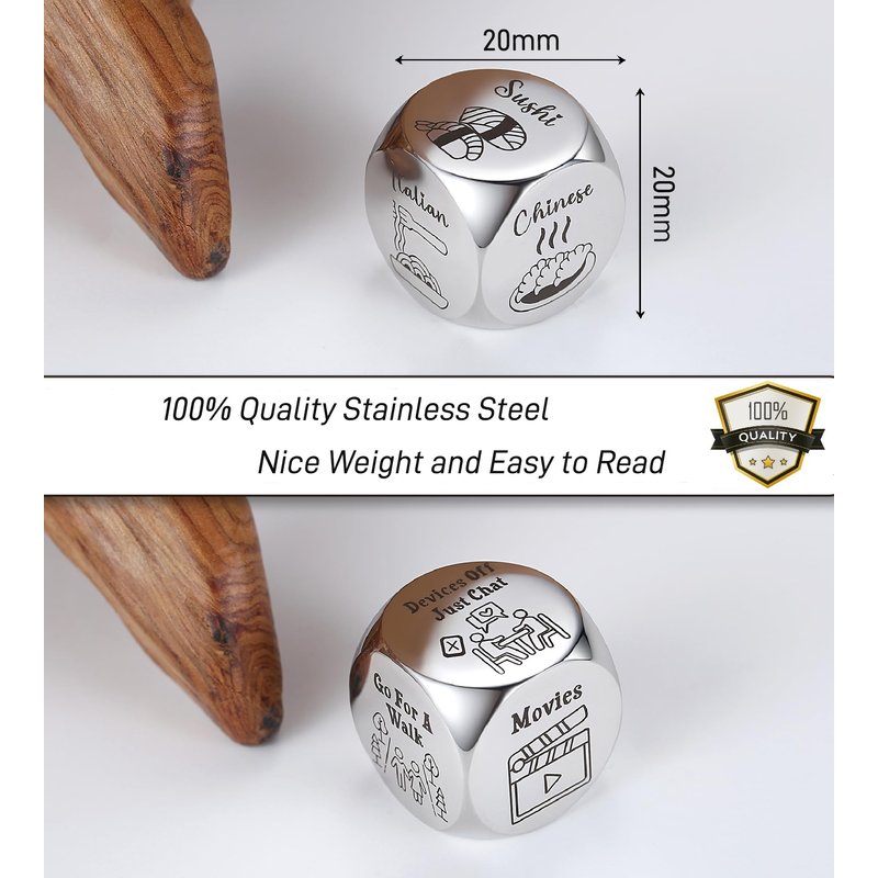 - 【 High Quality Date Night Dice 】The dice is made from hypo-allergenic surgical grade 316L stainless steel for long life. It will never fade, tarnish. And it has nice weight and easy to read. More attractive is that the dice is thoughtfully packaged and well protected in an eco-friendly gift box. Comes with a fun card, making your gifts extra special and meaningful. This cute dice is truly a great idea which will give you and your significant other a good laugh.