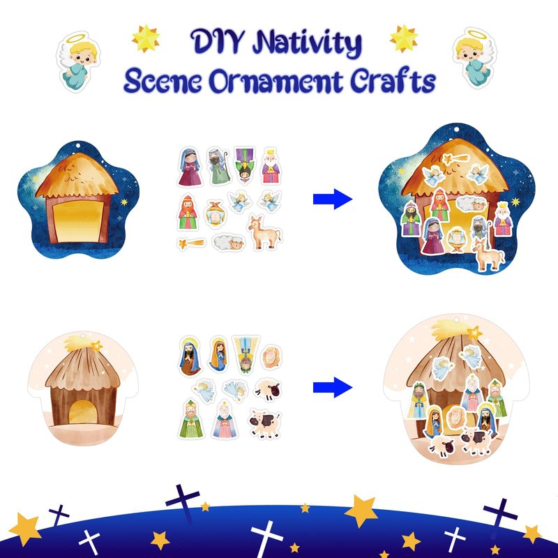 - 【Nativity Stickers Craft Kit】 This kit contains 24 sheets of backdrop paper, 24 sheets of nativity-themed stickers, and 24 ribbons, allowing you to customize your own nativity scene. Ideal for adorning Christmas trees.
