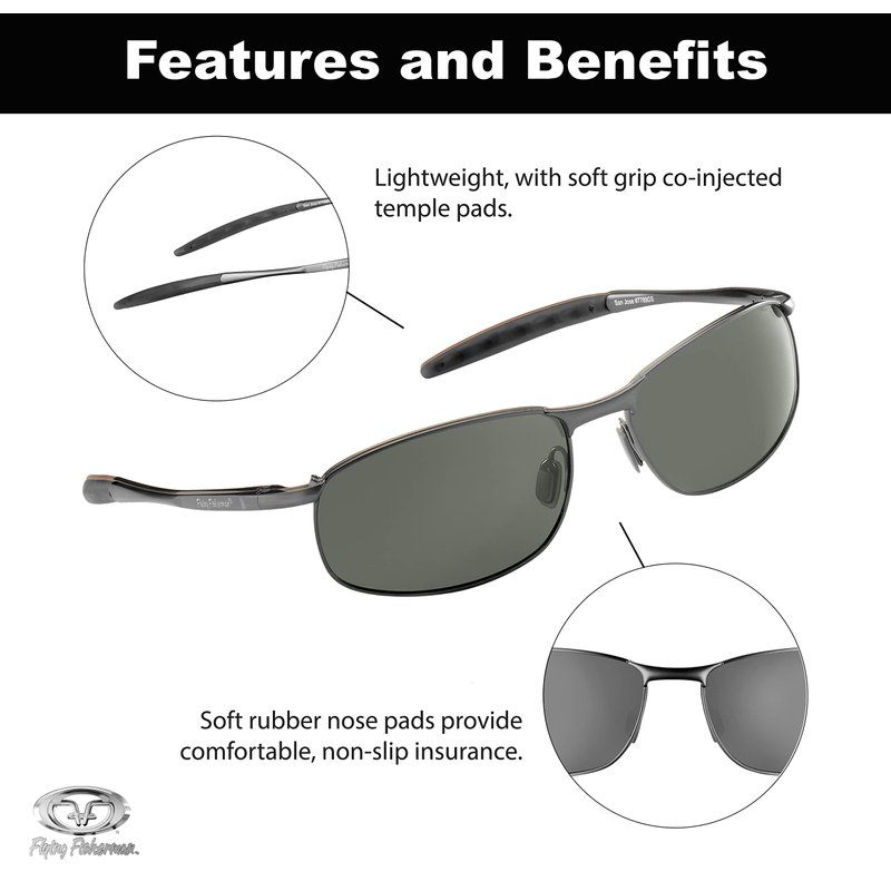 - SAN JOSE, GUNMETAL FRAMES/SMOKE LENS. Flying Fisherman Action Angler Sunglasses with polarized triacetate lenses improve visibility for any activity. They are scratch resistant, lightweight and durable so you can take them everywhere for any application