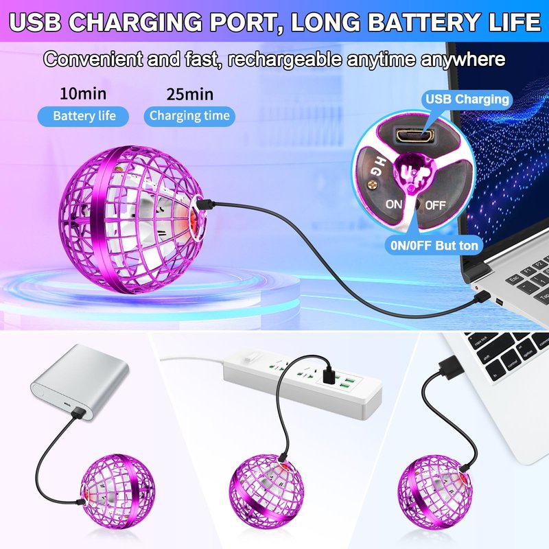 - 🎁【Safe and Durable Flying Orb Toy】This flying orb ball is rigorously tested and made of high quality materials, soft and durable, drop-proof, light and flexible. You do not have to worry about flying toys easily damaged by children. It will automatically stop when it hits the furniture or anything else. The propeller is located inside the flying ball toy, which is very safe for children.Recommendation: Children under 6 years old need to play with parents.