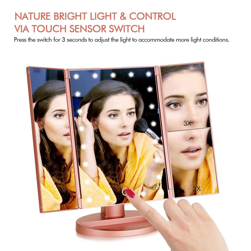 - TRI-FOLD DESIGN : Easy for take away and daily maintenance, can be opened or folded this light up mirror when not using to protect it away from the dust or scratches. Special crafted champagne ROSE GOLD color, quite elegant and sleek appearance. This is a good birthday gift for women.
