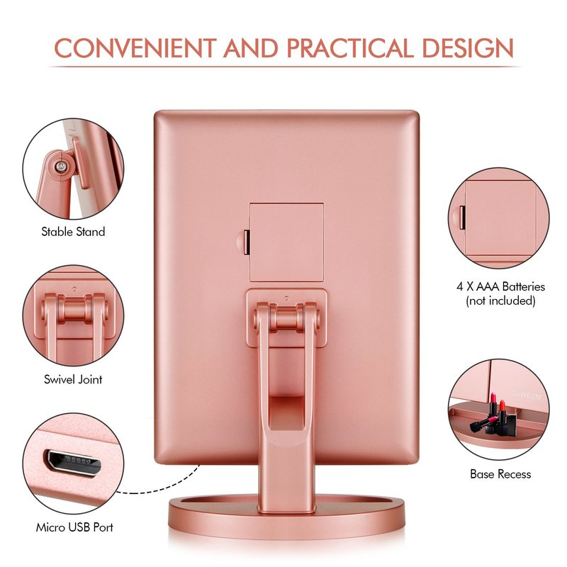 - BATTERIES AND MICRO USB POWERED: Operated by micro USB changing or 4AA batteries operated ( Battery not include, USB cord included), pls note that this lighted cosmetic mirror can't store power ). Made of high quality ABS plastic and high definition mirror glass.