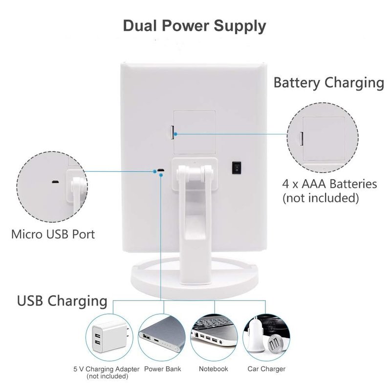 - BATTERIES AND MICRO USB POWERED: Operated by micro USB changing or 4AA batteries operated ( Battery not include, USB cord included), pls note that this lighted cosmetic mirror can't store power ). Made of high quality ABS plastic and high definition mirror glass.