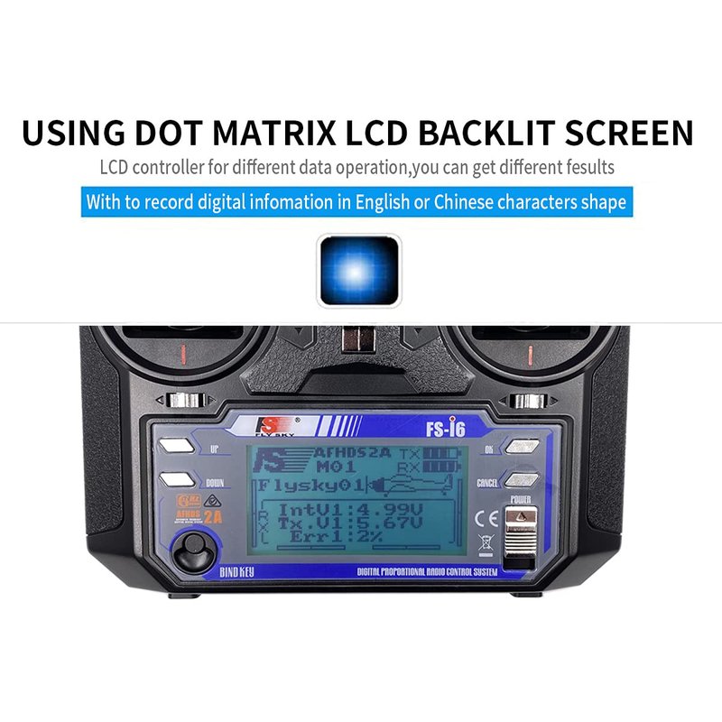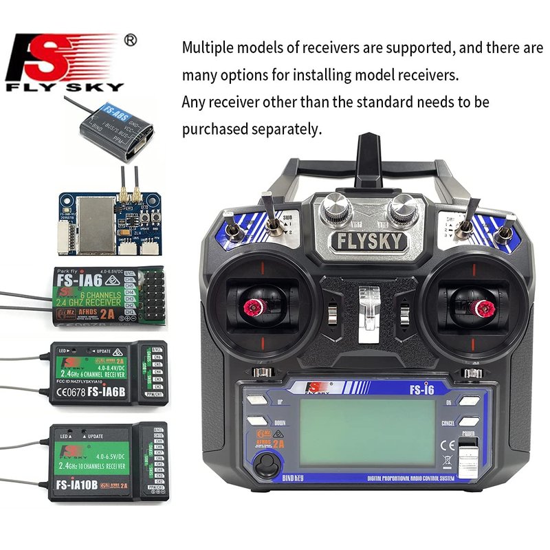 The transmitter and receiver have been pre-bound before delivery.If you are using another transmitter or receiver, follow the steps below to bind to the B/VCC port on the receiver. 1, Connect the supplied bind cable to the B/VCC port on the receiver. 2, Insert power into any other port. 3, Hold the "BIND KEY" while powering on the transmitter to enter bind mode. 4, Remove the power and bind cable from the receiver. Then connect the power cable to the B/VCC port. 5, Check the servos' operation. If anything does not work as expected, restart this procedure from the beginning. FS-i6 Specifications: Channels: 6 CH Model Type: Glider/Heli/Airplane RF Range: 2.40-2.48GHz brandwidth: 500KHz RF Power: Less Than 20dBm 2.4ghz System: AFHDS 2A and AFHDS Code Type: GFSK Sensitivity: 1024 Low Voltage Warning: less than 4.2V DSC Port: PS2;Output:PPM Charger Port: No ANT length: 26mm*2(dual antenna) Transmitter Weight: 392g Transmitter Size: 174x89x190mm Package Size: 23.5x21.2x10.6cm Package Weight: 676g Power: 6V, 4*AA Battery(Not included) Display mode: Transflective STN positive type, 128*64 dot matrix VA73*39mm,white backlight. On-line update:yes Certificate: CE0678,FCC Model Memories: 20 Control Range: 500m FS-iA6B Specifications: Channel: 6CH Frequency Range: 2.4055--2.475GHZ brand Width Number: 140 Transmitting Power: ≤ 20dBm RF Receiver Sensitivity: -105dbm 2.4G system: AFHDS 2A Code type: GFSK Antenna Length: 26mm * 2(dual antenna) Input Power: 4.0-6.5V DC Dimension: 47x26.2x15mm Weight: 14.9g i-Bus Interface: Yes Data Acquisition Interface: Yes Model Type: Airplane/Glider/Helicopter Compatible Transmitter: Compatible with FS-i6,FS-I6X,FS-I6S,FS-i4 Package Included: 1 x FS-i6 transmitter 1 x FS-iA6B Receiver 1 x Manual