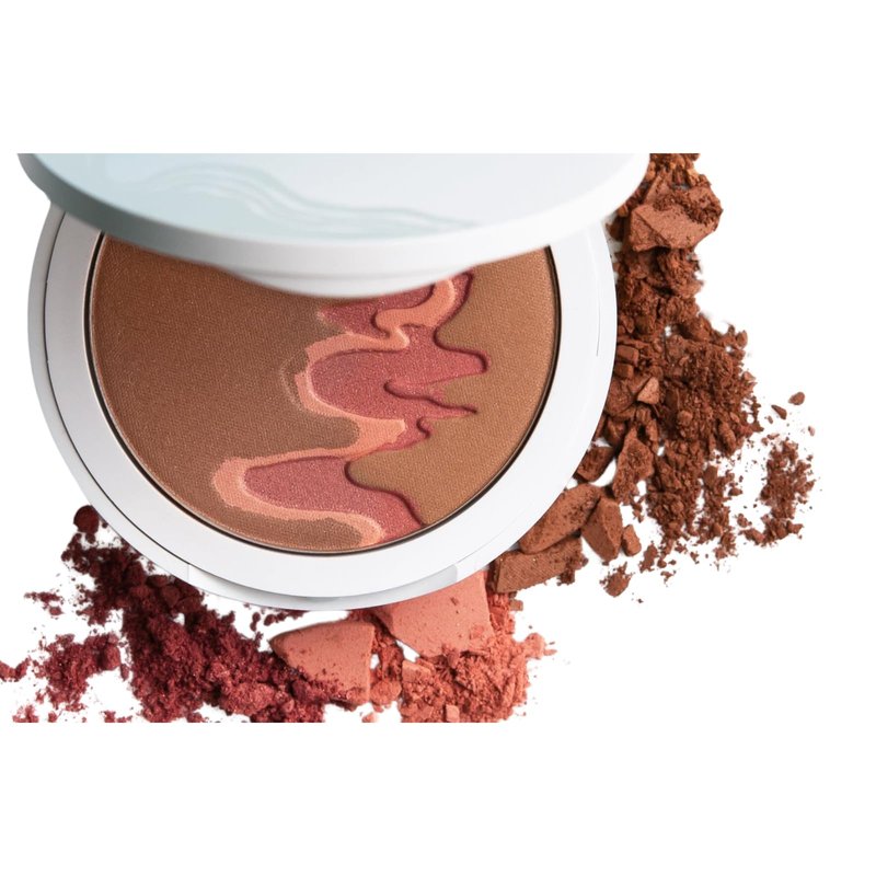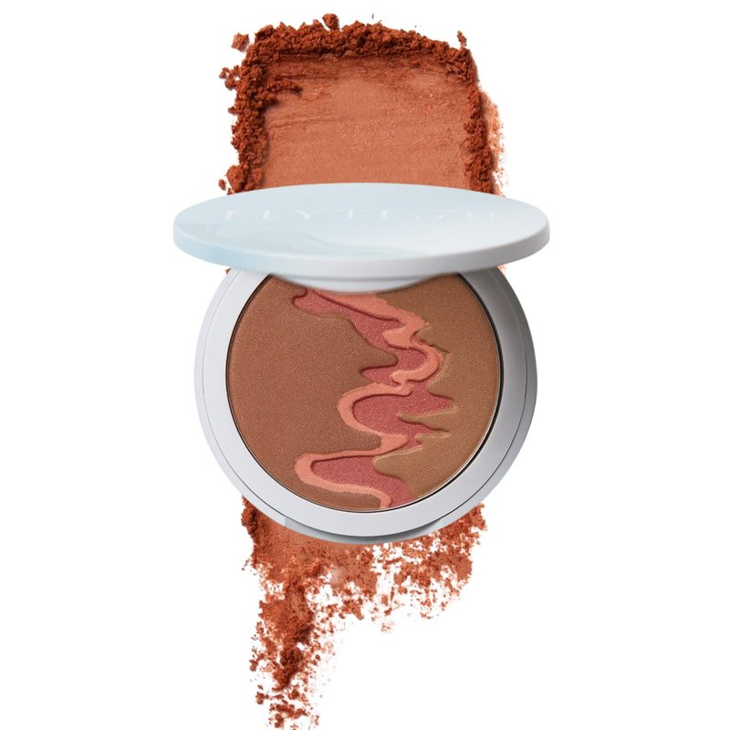 Flyte.70 Color Back Burnished Bronze Facial Powder in "Look of Love" showcases a mix of rich bronze and pink tones, creating a soft, sun-kissed look. The blend of shades provides a natural, alluring look that mimics the warmth of a fresh tan. The buildable formula allows you to layer for more intensity, offering versatility whether you're looking for a soft flush or a more dramatic, contoured effect.