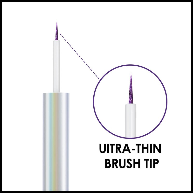 1. The eyeliner appears to change to 2-3 colors when viewed from different angles depending on the lighting. Use pigmented liquid liner’s fine brush tip to shape the eye with a saturated and metallic finish.