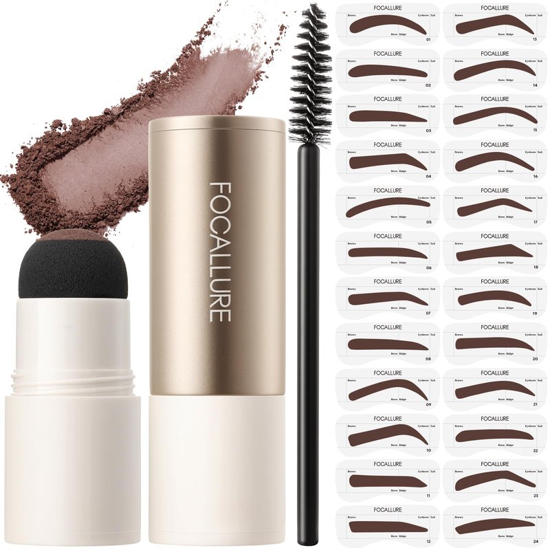 FOCALLURE Eyebrow Stamp and Eyebrow Stencil Kit, 24 Reusable Brow Shape, Sweatproof Eyebrow Powder, Long-Lasting, Easy to Use, Filling and Shaping Perfect Eyebrow Makeup, MEDIUM BROWN