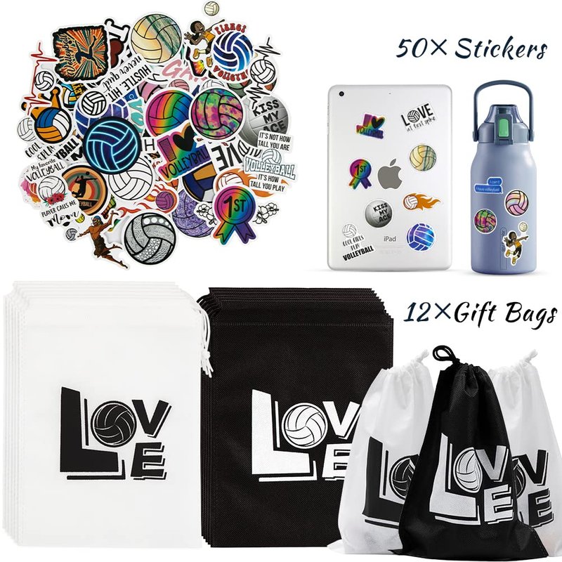 - PACKAGE INCLUDES: 12 volleyball necklaces, 12 volleyball key chains, 12 volleyball inspirational silicone wristbands, 12 volleyball sport hair ties, 12 volleyball brooches, 12 volleyball drawstring bags, 50pcs volleyball stickers