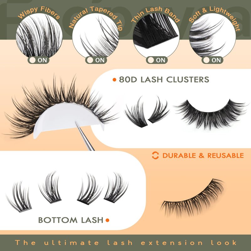 - DIY Eyelash Clusters for Beginners: The product revolutionizes the eyelash extension process by enabling users to achieve salon-quality results at home. With an easy-to-follow, 1 minute application process the clusters facilitate a stunning transformation for beauty enthusiasts of all skill levels