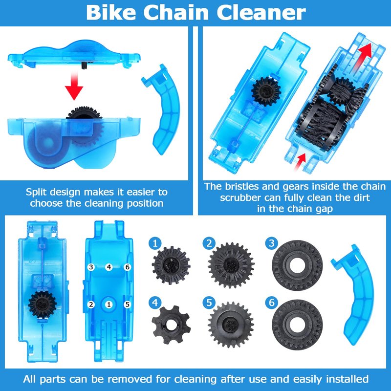 - [A must-have for post-ride clean up]:focopot Bike chain cleaner kit (7pcs) includes chain lubricant, biodegradable degreaser, chain scrubber, gear brush, gear hook,gloves and cleaning towel to effectively clean and maintain your bike chain.
