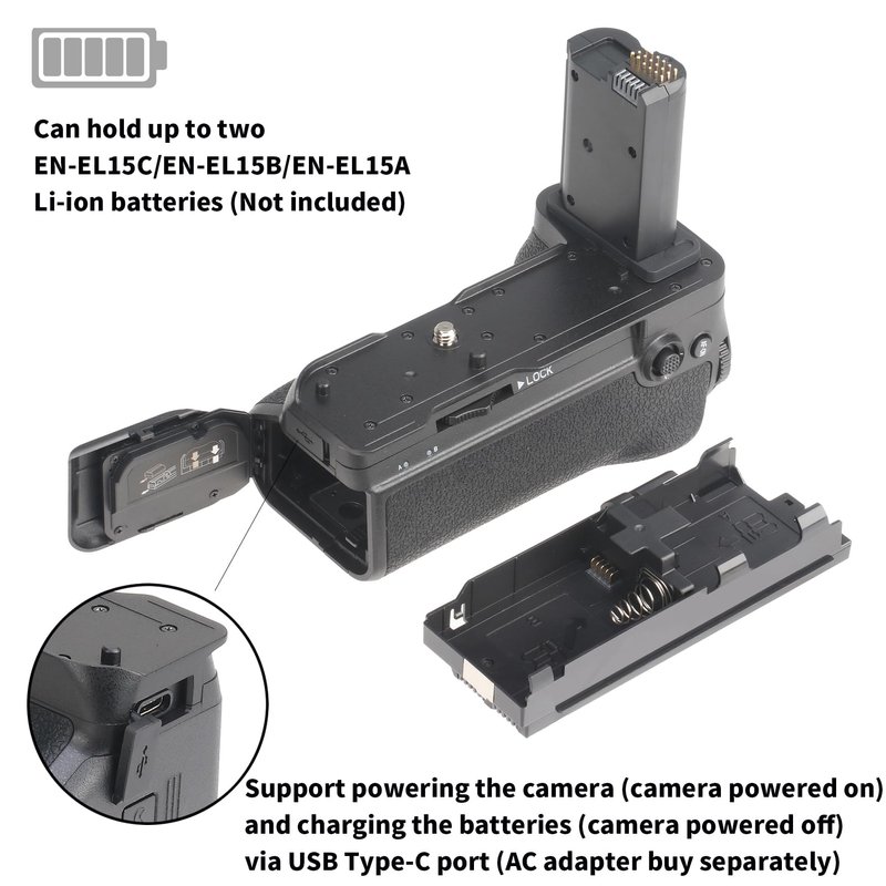 Compatible battery: one or two EN-EL15C/EN-EL15B/EN-EL15A batteries (Battery not included)