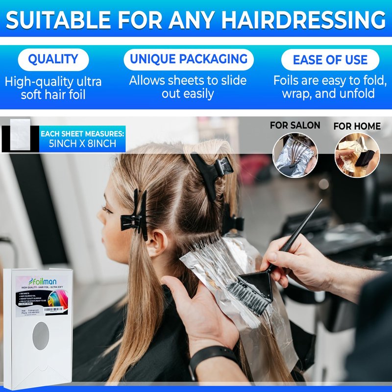 * "Introducing Foilman's Ultra Soft Hair Highlighting Foil - the ultimate game-changer for salons, hair stylists, and at-home colorists! * Say goodbye to tedious cutting and hello to effortless highlighting with our pre-cut, 5x8 inch Hair Foil sheets. Our convenient and compact box contains 500 sheets, perfect for stocking up or taking on-the-go. * What sets us apart? Our Ultra Soft Hair Foil is incredibly smooth, gentle on hair, and ensures even color distribution. It's the perfect blend of quality and comfort. * Whether you're a seasoned pro or a DIY enthusiast, our Hair foil makes it easy to achieve salon-quality highlights. Plus, our sleek box display keeps your workspace organized and stylish. * Treat yourself and your clients to the best - choose Foilman's Ultra Soft Hair Highlighting Foil for a hassle-free, high-quality highlighting experience!"